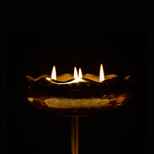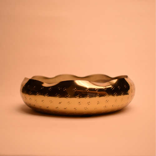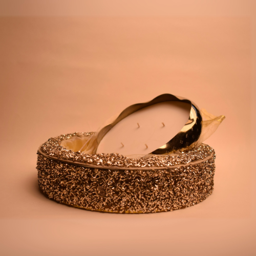 Crafted in a stunning golden bowl with fluid edges & textured with intricate, hammered patterns that create a shimmering effect. The irregular marks and indentations add depth and character to the bowl. 'Celestial' is infused with cherished fragrances from our archives, it fills the room with comforting aroma & the gentle flicker of its flame, creating a serene and festive ambiance. Illuminate your space with love, light, and the beauty of this exquisite masterpiece! Available in 3 fragrances: