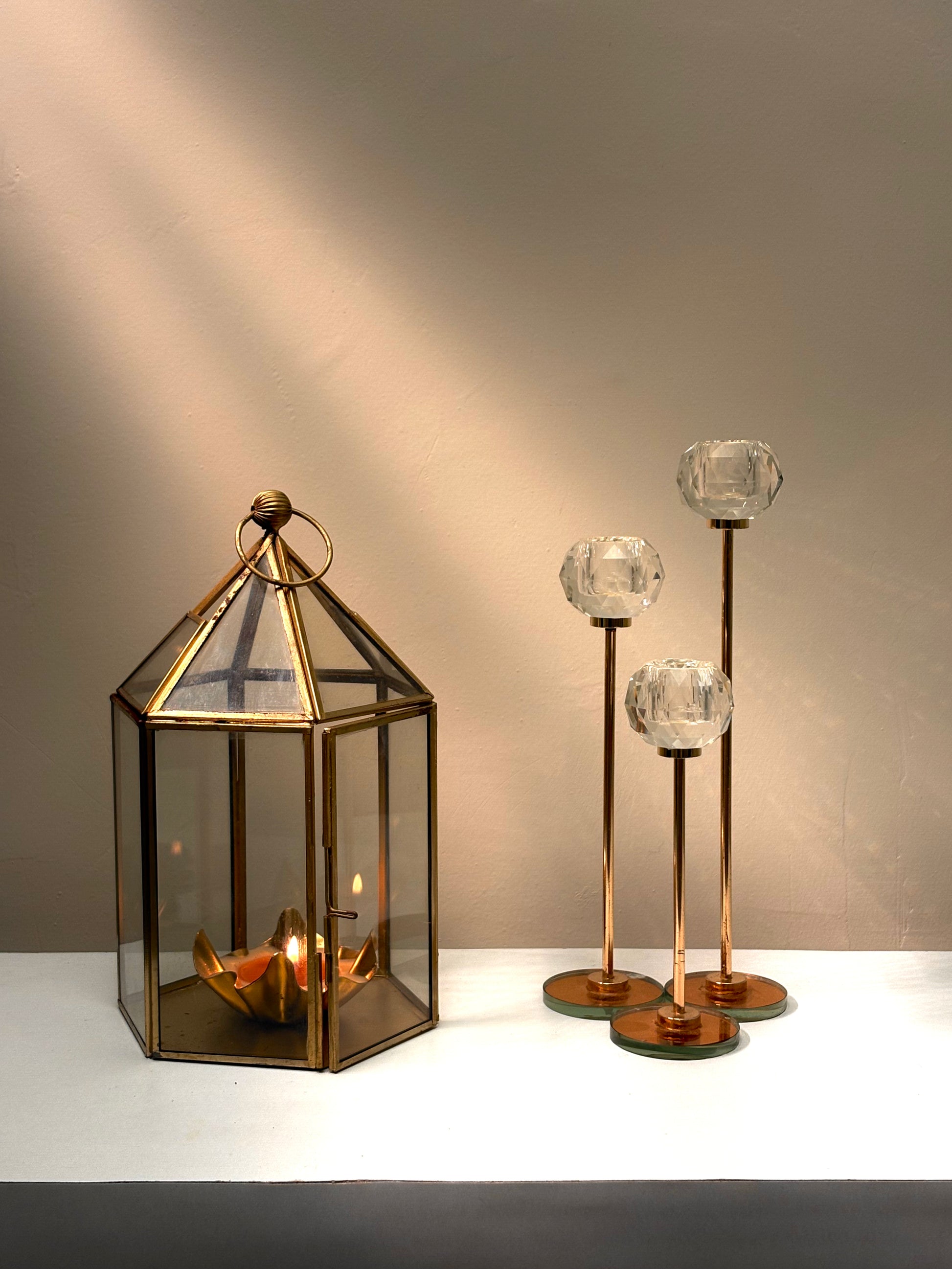 Add a touch of timeless glamour and sparkle to your decor with this set of three Crystal-Topped Taper Candle Holders. Each holder features a stunning, faceted crystal globe cup perched atop a sleek, varying-height gold stand. The crystal catches and refracts the light, creating a beautiful, diamond-like glow that enhances the flame of your taper candles. Staggered heights make them an instant centerpiece on a dining table, mantel, or entryway console, blending modern elegance with classic luxury.