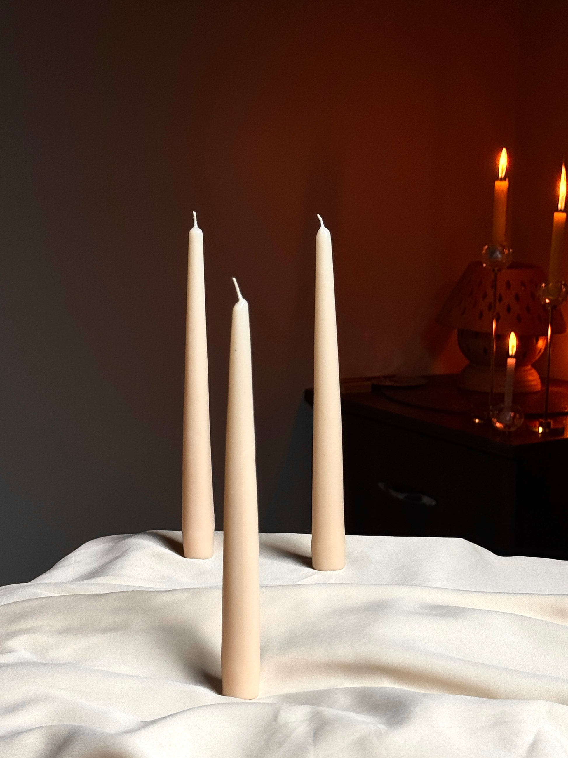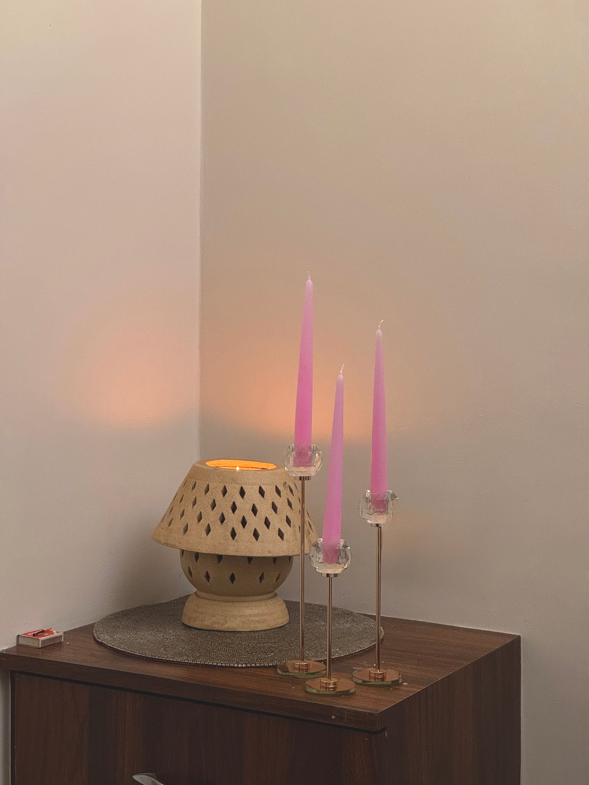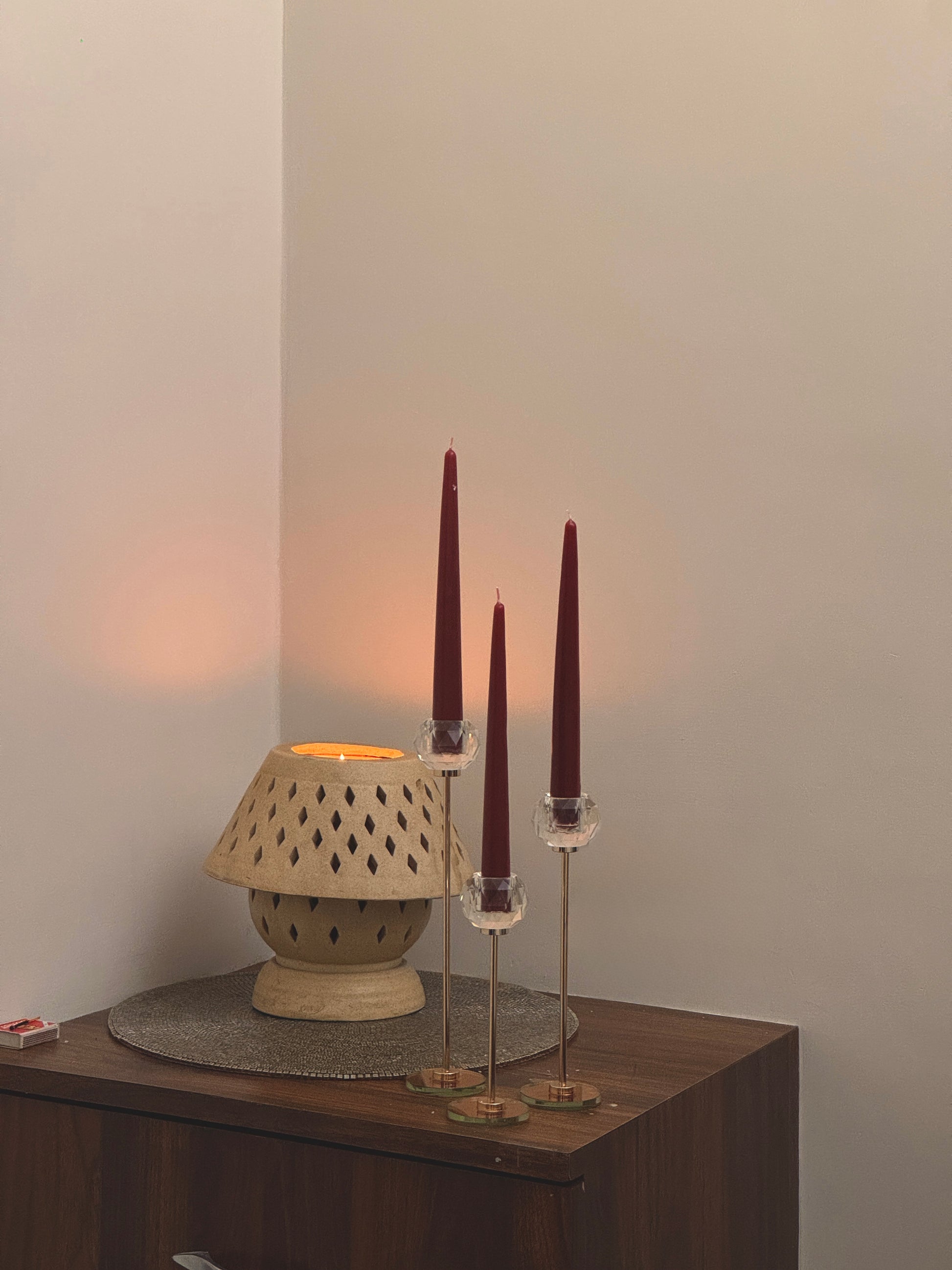 Place the taper candle securely in a proper-sized holder or heat resistant surface ensuring it's stable and upright. Light the wick, and enjoy the soft, ambient glow. For best results, trim the wick to about 1/4 inch before lighting each time to prevent excessive flickering.