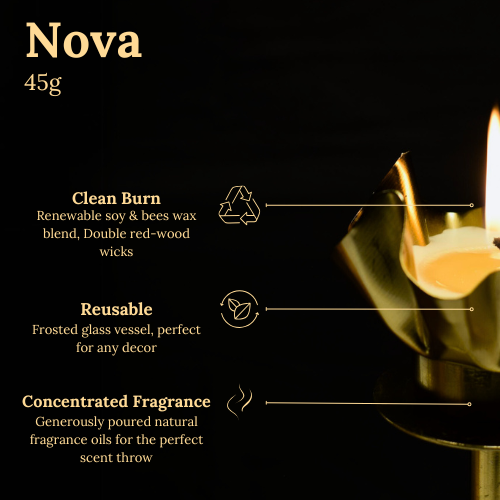 Nova candle has beautiful folds with the edges like soft waves that describes various aspects of life, imperfections, the complexity of emotions, rich experiences, resilience & strength. This Diwali illuminate your homes with this candle that remind us of the beauty in the strength found in renewed appreciation for the intricate tapestry of life, and the shared humanity that connects us all. A perfect décor piece for your favorite little spots of your home! Available in 5 fragrances: